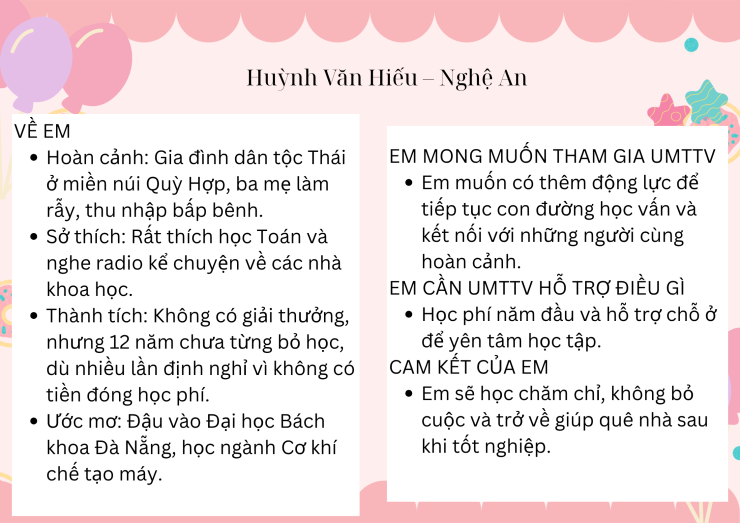 Ước mơ: Đậu vào Đại học Bách khoa Đà Nẵng, học ngành Cơ khí chế tạo máy.