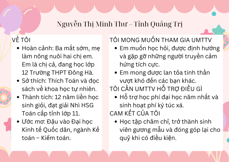 Hoàn cảnh: Ba mất sớm, mẹ làm nông nuôi hai chị em. Em là chị cả, đang học lớp 12 Trường THPT Đông Hà.