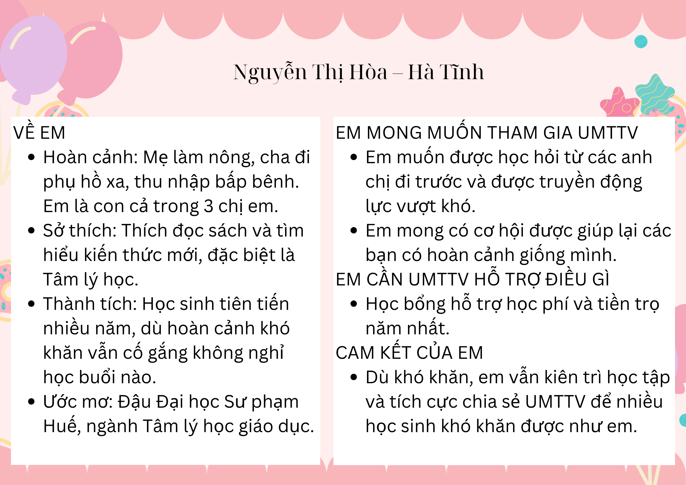 Ước mơ: Đậu Đại học Sư phạm Huế, ngành Tâm lý học giáo dục.